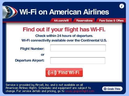 American Airlines Wi-Fi Widget Goes Mobile CheapOair Staff September 24, 2010 general American Airlines business travelers can now check in ahead of time on their mobile devices to find out if their plane has Wi-Fi access. That's because aa.com now makes it possible for passengers to type in their flight number or departure airport and see if Wi-Fi will be offered in-flight from their internet enabled mobile devices. American said the widget has been very popular with customers since it was launched on AA.com. American offers Wi-Fi on all available flights within the continental United States. Vice president of marketing, Rob Friedman, commented on the news: "We know our customers are mobile by definition, and having information they want and need on the go can simplify and enhance the travel experience for them." Source: aa.com