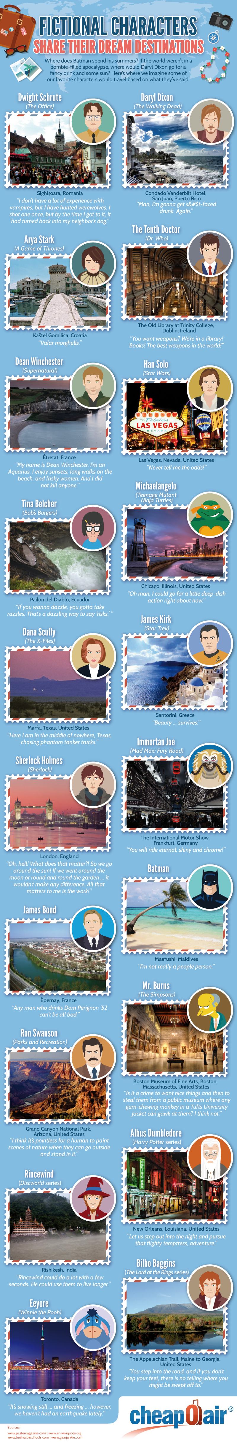 Fictional Characters Share Their Dream Destinations Morly Cowan January 12, 2016 International Travel, Travel Tips, Trending Stories Planning a vacation but don’t know where to go? Why not take inspiration from some of our favorite fictional characters! We’ve used quotes from Batman, Daryl Dixon, Captain Kirk, and others, to put together one-of-a-kind destinations and attractions in this infographic. So, let’s plan an unreal (get it?) dream vacation with our favorite folks! Got some ideas of your own? Let us know in the comment section below. Do you want to use this InfoGraphic? 1. Click on the box below. 2. Ctrl+A to select all. 3. Ctrl+C to copy. 4. Paste (Ctrl +V) the code into your page </p> <p><a href=”https://www.cheapoair.com/miles-away/wp-content/uploads/2016/01/DreamDestinationsOK.png”><br /> <img src=”https://www.cheapoair.com/miles-away/wp-content/uploads/2016/01/DreamDestinationsOK.png” width=”750px” title=”Dream Destinations of Fictional Characters – CheapOair” alt=”Fictional Characters Share Their Dream Destinations” border=”none”><br /> </a></p> <p><a href=”http://www.cheapoair.com” style=”font-family:Arial, Helvetica, sans-serif; font-size:12px; color:#076ba7; padding-left:158px;”>Book Your Next Trip</a></p> <p>