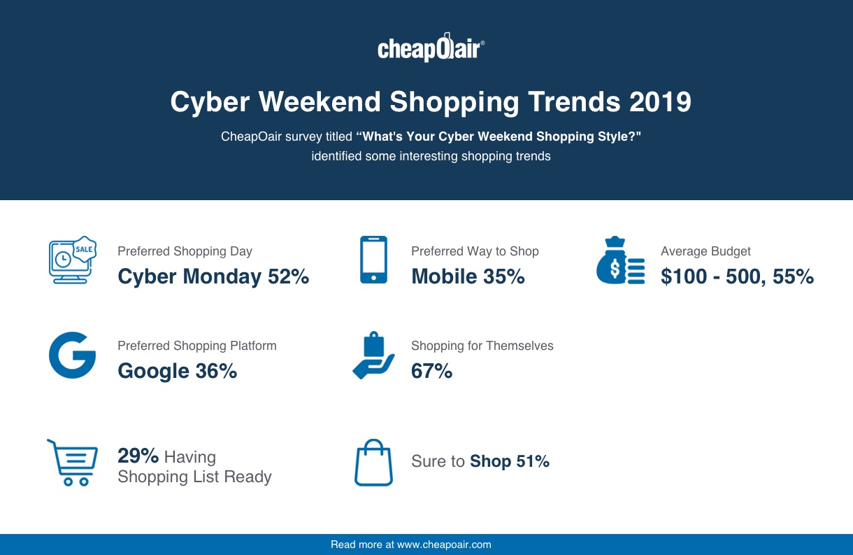 Results Are In! Check Out CheapOair’s Cyber Weekend 2019 Survey CheapOair Staff November 14, 2019 Travel Stories Disclaimer Our survey was conducted between October 16 and 25, 2019 via Microsoft Forms, which was circulated over email. We surveyed 150 U.S. adults and most of our insights came from those who will be shopping Cyber Weekend. In a recent CheapOair survey, we asked U.S consumers about their purchasing preferences and shopping plans for the highly anticipated Cyber Weekend 2019. If you’re curious to see what you’re deal-hunting competition looks like, how much shoppers are planning to spend and of course what they’re shopping for this year, check out what we discovered! Survey Highlights: 67% said they are shopping for themselves 52% said Cyber Monday is the preferred day to shop 35% said they prefer to shop via a mobile device To Shop or Not to Shop…That Is the Question. We asked U.S. consumers if they were planning to participate in Cyber Weekend this year and 51% said they plan to shop on at least one of the shopping days. Surprisingly, 35% of the respondents are still deciding on whether they want to take part in the shop-til-you-drop weekend, while 14% said they won’t be shopping at all this Cyber Weekend. Making a (Shopping) List and Checking It Twice. No, not to check if you’re being naughty or nice—but to see if shoppers have their shopping carts ready to go! When asked if their Cyber Weekend shopping lists were made yet, only about a third of those surveyed (29%) said they’re ready to shop—list in hand. Almost half (43%) said they don’t have shopping lists at all, while the rest (28%) said: “we’re working on it”. Cyber Weekend 2019 Motto: Treat-Yourself. Sorry loved ones—according to our survey, it looks like Cyber Weekend shoppers are leaning into some self-care this year. A whopping 67% of respondents said they’ll be taking advantage of those many deals and discounts to shop for themselves. But don’t worry, there’s still a good amount of consumers (27%) that will be buying for family and friends! Let’s Talk Budgets. With Thanksgiving falling a week later than last year, the scramble to purchase holiday gifts is in full swing—and so is figuring out budgets to do so. Whether the purchase is a gift, for yourself, in-store or online setting a budget ahead of time is key to keeping your focus on getting exactly what you want and/or need, without overspending. Of those shopping this year, 55% said their budget range somewhere between $500 and $1000. Coming in second, are the budget-friendly shoppers (31%) with a spending range between $100-$500 and in last place are the big-spenders (14%) who have a budget over $1000. Cyber Monday, Black Friday, and Thanksgiving Sales… Oh, My! This year, it looks like Cyber Monday’s popularity might just turn Black Friday blue! When it comes to U.S consumers’ preferred day to shop, respondents favored Cyber Monday over twice as much as Black Friday. Around 52% of respondents have plans to shop on Cyber Monday, whereas 27% will be shopping throughout Thanksgiving week. And only 21% of the respondents said that they would prefer to shop on Black Friday over any other day. Digital Shoppers Will Have Their Hands Full… …After all, you’ll need two hands to hold that smartphone or laptop to catch all the best bargains! Long gone are the days of lining up outside the doors to your favorite stores to score Cyber Weekend discounts. True to their preferred shopping day (see above) shoppers are going truly cyber—voting online shopping as their favorite way to shop. Among the many ways to go deal-digging, 35% of the respondents prefer shopping on a mobile device, while a laptop is a close second at 33%. About a fifth of those surveyed (22%) are still sticking to desktop computers for their shopping, whereas only 10% of the respondents prefer shopping at some good ol’ brick-and-mortar stores. All Aboard the Search Engine! When it comes to online shopping, everyone has their own method, so we asked consumers which online platforms they preferred to find their Cyber Weekend deals this year. Our survey revealed a pretty even split between Googler’s (36%; people who rely on Google to find deals), loyalists (34%; those who go directly to their favorite or specific online stores), and, of course, those who are still undecided (30%) What’s your Cyber Weekend shopping style? Tell us in the comments below!